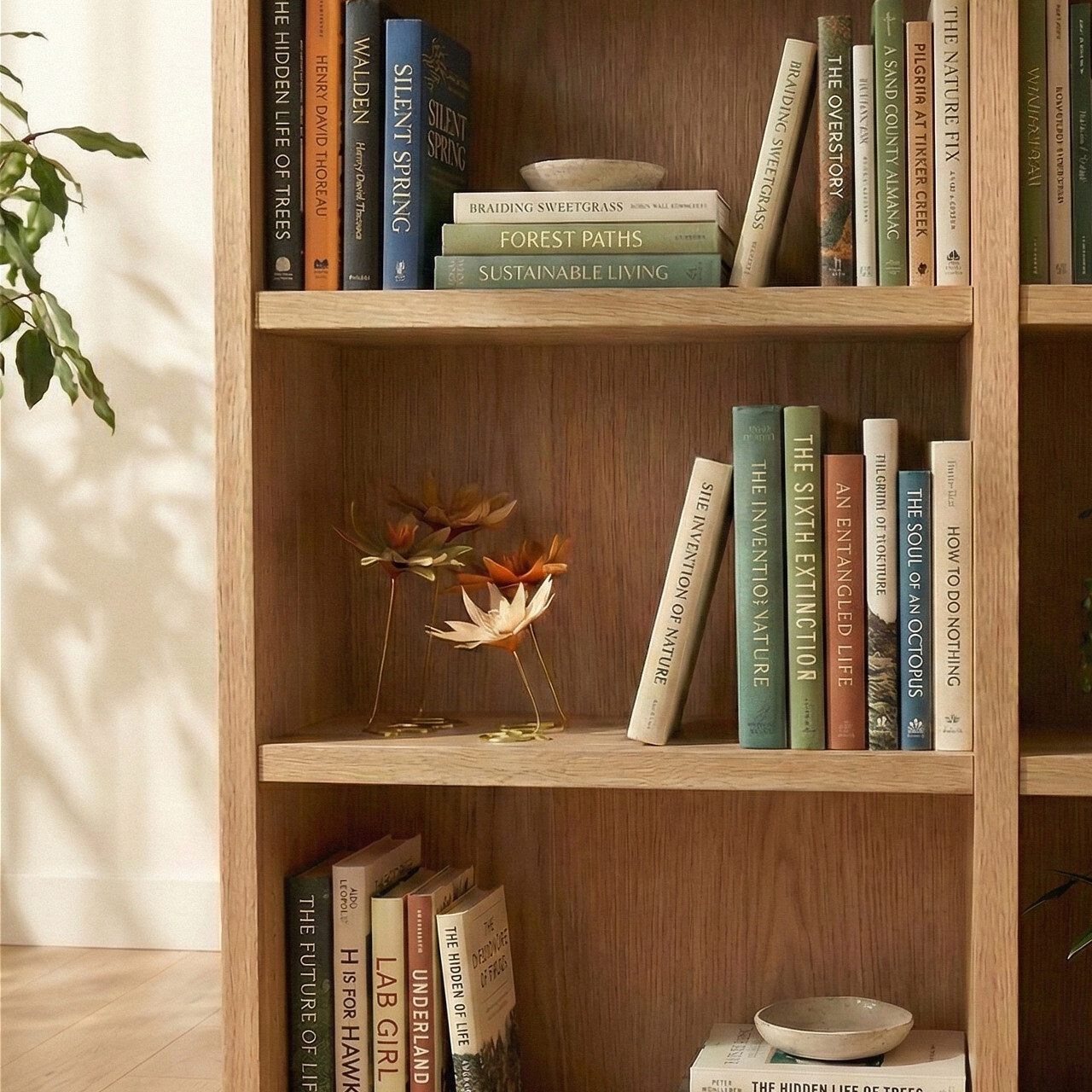 花瓶が必要ない分、高さのスペースの無い本棚などにも飾りやすくなっています。