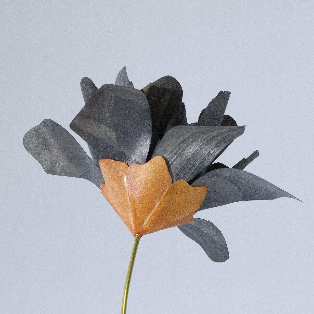 茎には柔らかい真鍮を使っているので自由に形を変形できます。葉っぱの形にして可愛く飾れるように考えました!