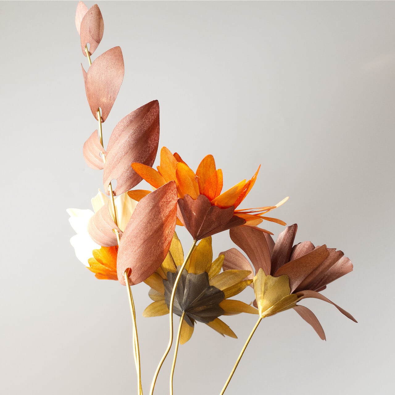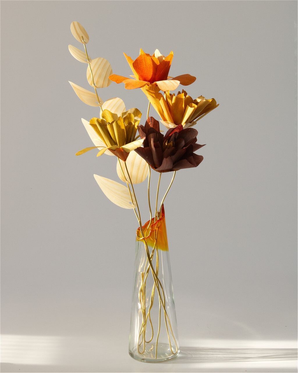 【配送時の形状について】 届いてそのまま花瓶に挿せるよう、茎を画像の高さのバランスに合わせて「曲げた状態」で紙の箱に梱包いたします。(※柔らかい真鍮線ですので、お客様の手で自由に伸ばしたり、形を変えることが可能です)