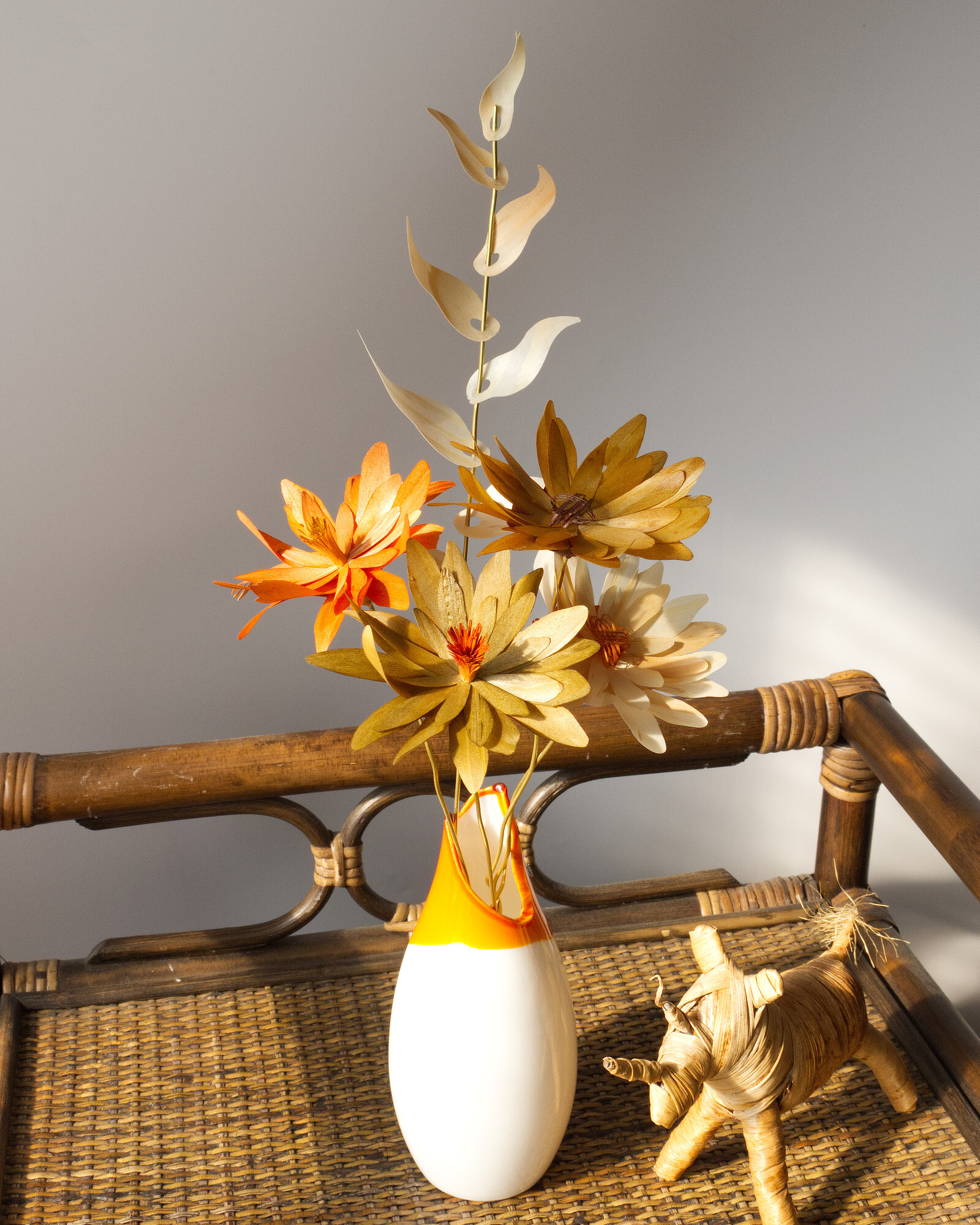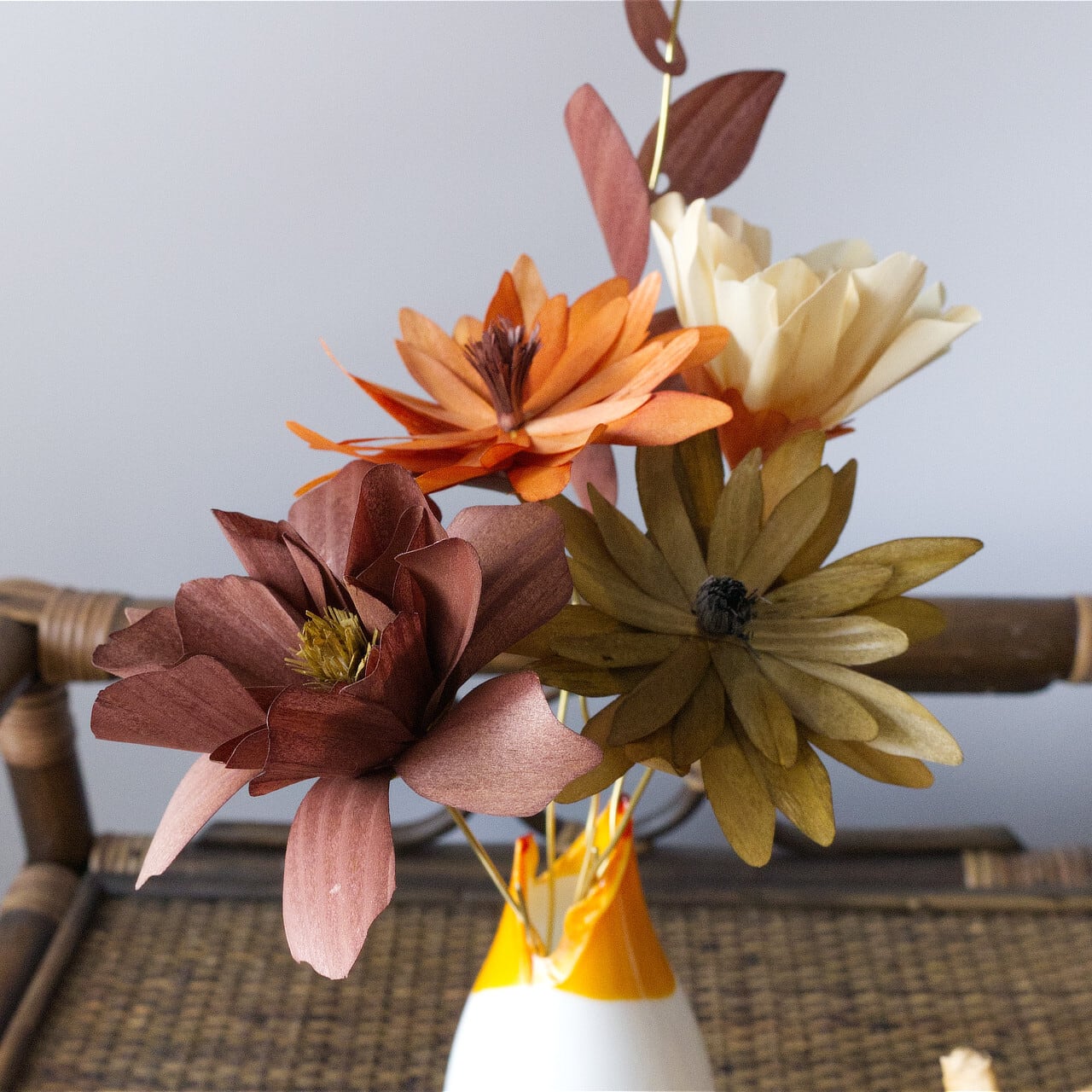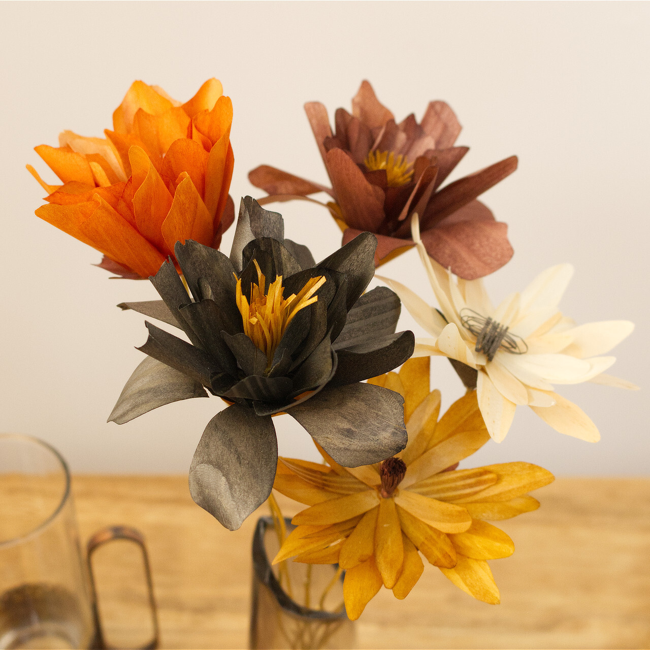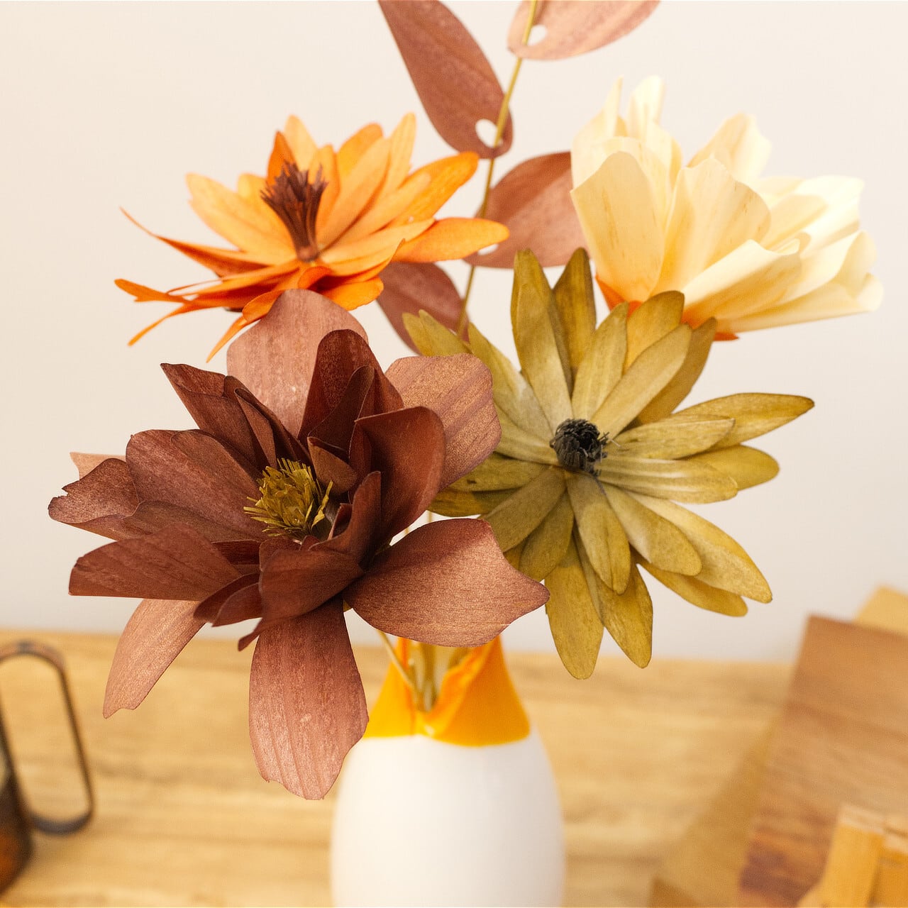 木材の温かみを尊重した色にしています。全部で7色のツートンカラーになっており、花びらのカラー&芯と根本のカラーになっています。