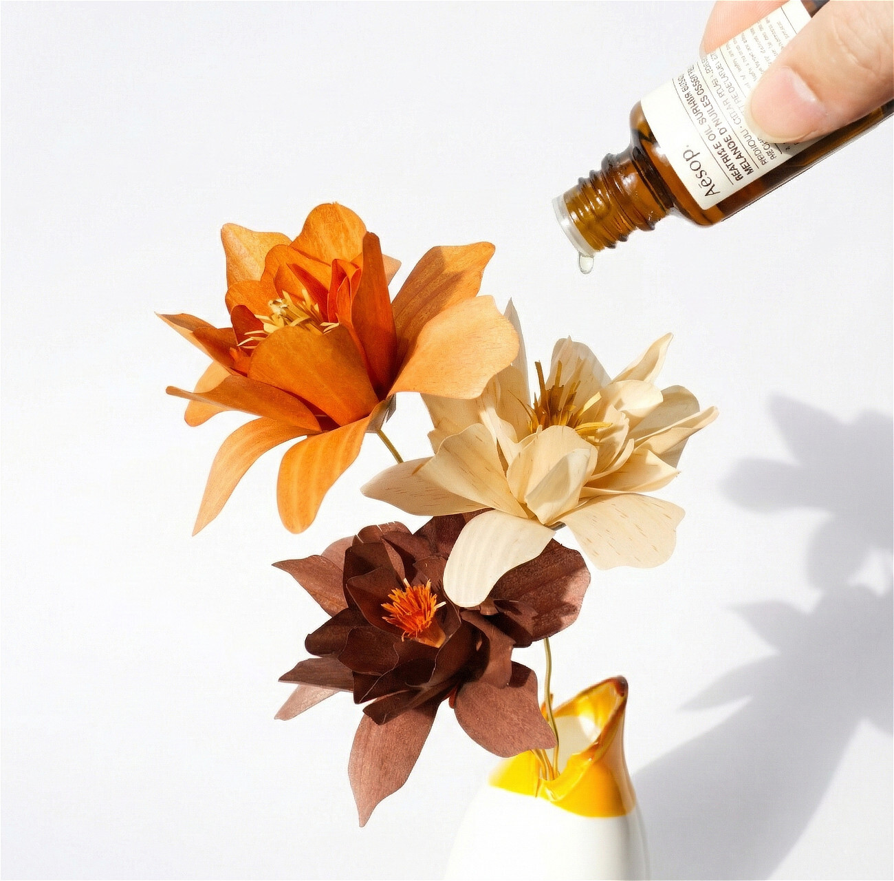 ※アロマを垂らした部分は「色が濃くなる」性質があります。「芯」に垂らしていただくと、オイルの跡が自然に馴染み、木の花の美しさを損ないません。