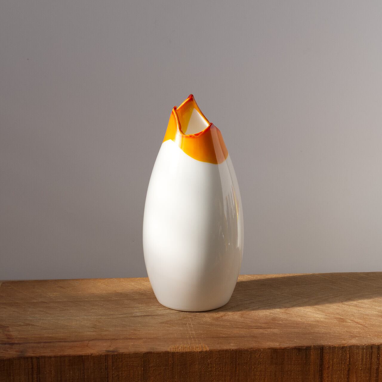 オプションでギフト用のオリジナルバッグもご用意しています。ポテチの袋をモチーフに、上下にギザギザを加工を施しました。色はオレンジのみで、大きさは製品に合わせてこちらでピッタリのサイズを選定します。
